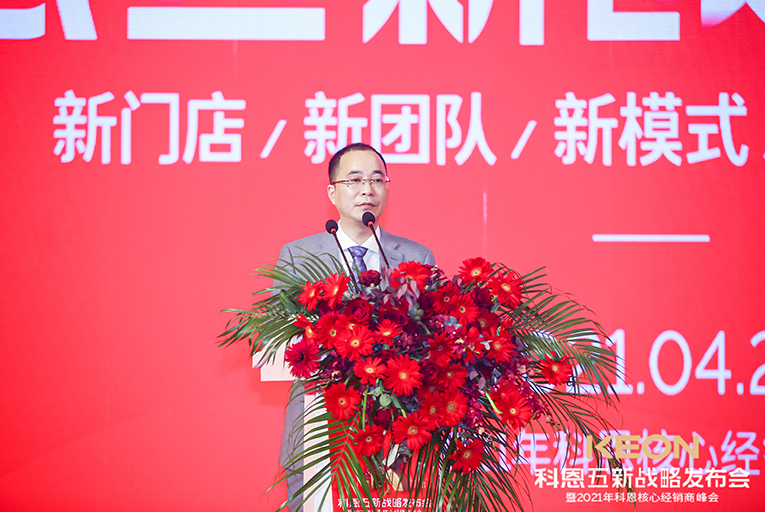 一場震撼全場的沙畫表演后正式會議正式開始,科恩電器董事長俞鋒率先上臺致辭,首先對現場所有人表達了誠摯的感謝。2021年科恩電器將乘風破浪拉開新帷幕,開啟全新篇章。隨后,科恩電器營銷總經理趙漢斌發布“五新戰略”:新門店、新團隊、新模式、新目標、新未來!不忘初心,方得始終,一起開創新時代、新征程!