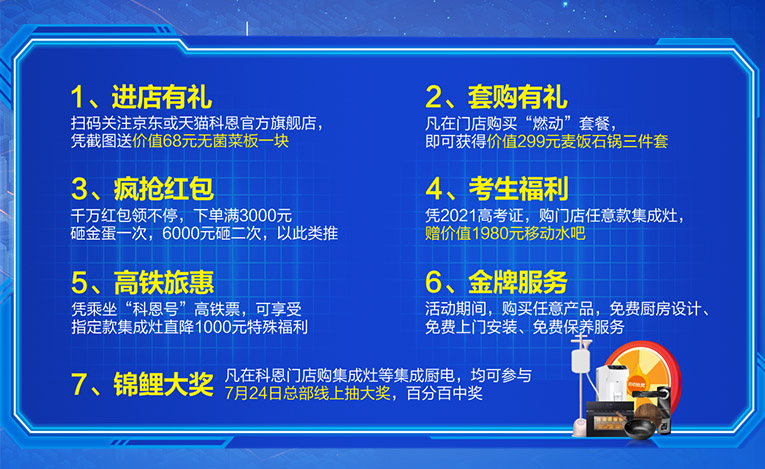特權一進店有禮:掃碼關注京東或天貓集成灶十大品牌、廚電行業十大品牌科恩官方旗艦店,憑截圖送價值68元無菌菜板一塊;特權二套購有禮:凡在門店購買“燃動套餐”,即可獲得價值299元麥飯石鍋三件套;特權三瘋搶紅包:千萬紅包領不停,下單滿3000元即可砸金蛋一次,6000元即可砸兩次,以此類推;特權四考生福利:憑2021高考證,購門店任意款集成灶,贈價值1980元移動水吧;特權五高鐵旅惠:憑乘坐“科恩號”高鐵票,可享受指定款集成灶直降1000元特殊福利;特權六金牌服務:活動期間購買任意產品,免費廚房設計、免費上門安裝、免費保養服務;特權七錦鯉大獎:凡在科恩門店購集成灶等集成廚電,均可參與7月24日總部線上抽大獎,百分百中獎;買廚電選科恩,七大特權享不停,7月24日總部線上大抽獎,現場抽取多個錦鯉大獎,百分百中獎,蒸/烤箱、移動水吧、高端指紋鎖、品牌掛燙機等等超值禮品等你拿!這個七月最燃是科恩,下個錦鯉就是你~