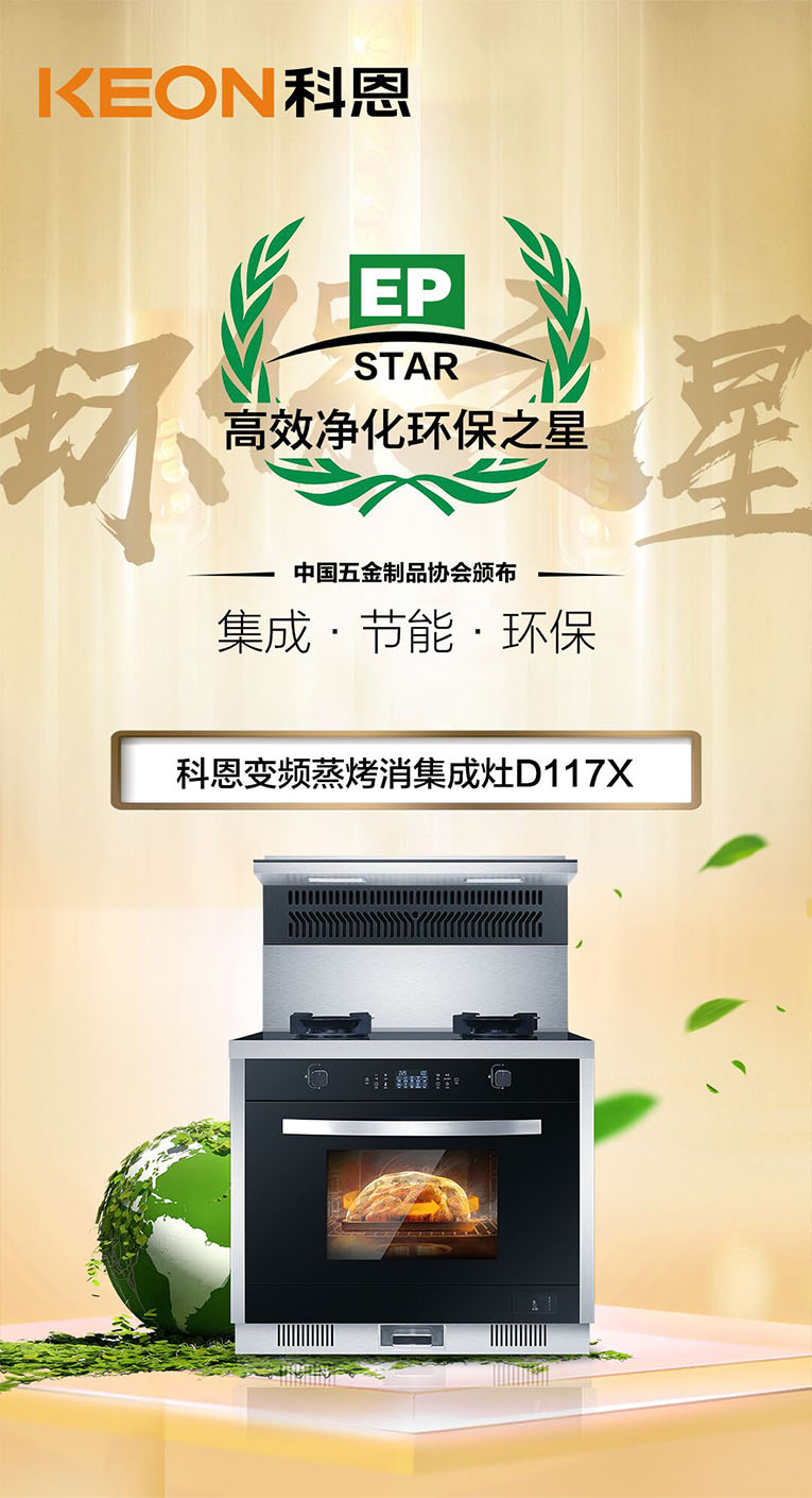 科恩D117X集成灶在眾多品牌中脫穎而出,斬獲由中國(guó)五金制品協(xié)會(huì)頒發(fā)的2020年中國(guó)集成灶“高效凈化環(huán)保之星”。