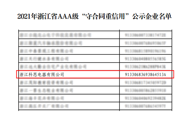 根據(jù)《浙江省“守合同重信用”企業(yè)公示辦法》規(guī)定,由企業(yè)自愿申報(bào)、系統(tǒng)自動(dòng)測(cè)評(píng)、各地核實(shí)推薦、大數(shù)據(jù)比對(duì)和雙隨機(jī)實(shí)地核查,2021年浙江省AAA級(jí)“守合同重信用”企業(yè)公示名單出爐,憑借著誠(chéng)信守法的“契約”精神,嚴(yán)謹(jǐn)規(guī)范的合同管理體系以及良好的經(jīng)營(yíng)效益,進(jìn)一步強(qiáng)化“守法”意識(shí)的浙江科恩電器有限公司榮獲浙江省AAA級(jí)“守合同重信用”榮譽(yù)。