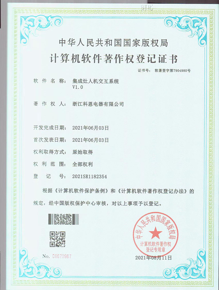 近日,由浙江科恩電器有限公司完全自主研發(fā)的集成灶人機(jī)交互系統(tǒng)V1.0軟件正式獲得國(guó)家版權(quán)局頒發(fā)的計(jì)算機(jī)軟件著作權(quán)登記證書。計(jì)算機(jī)軟件著作權(quán)是企業(yè)核心自主知識(shí)產(chǎn)權(quán),是企業(yè)的“無(wú)形資產(chǎn)”,是企業(yè)科技的生命力和價(jià)值所在。同時(shí),國(guó)家權(quán)威部門的認(rèn)證將使搭載這些軟件的產(chǎn)品價(jià)值倍增。此次集成灶十大品牌、廚電行業(yè)十大品牌科恩集成灶獲得計(jì)算機(jī)軟件著作權(quán),充分展現(xiàn)了企業(yè)強(qiáng)大的研發(fā)實(shí)力和核心競(jìng)爭(zhēng)力。