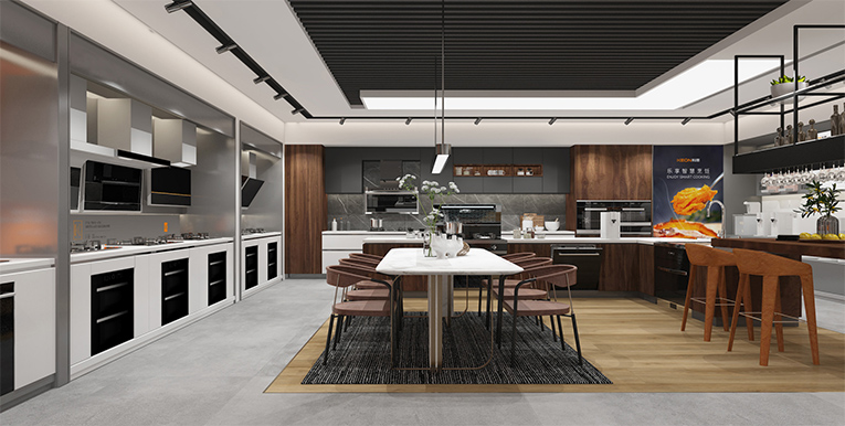 科恩新門店簡約、大氣、精美的視覺沖擊讓人印象深刻,開放式瀏覽路徑,通過“視覺+產品+體驗”的融合,以差異化彰顯品牌個性,讓消費者通過感知產品來感受品牌,對多個區域進行場景重構,產品陳列區、廚房場景、品牌背書、洽談區等,通過模塊化的方式,將核心產品模塊以及開放式廚房體驗場景植入門店。