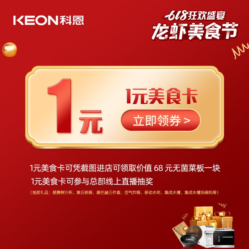 萬人品美食,0元搶科恩,5月28日——6月18日,凡購買1元美食特權卡的用戶,即可參與總部線上直播抽獎活動:便攜榨汁機/章丘鐵鍋/康巴赫鍋具三件套/空氣炸鍋/移動水吧/集成水槽等/集成水槽洗碗機.1元購卡,送價值68元無菌菜板,還能獲得直播大抽獎資格,重磅豪禮有機會收入囊中,有沒有很心動?!
