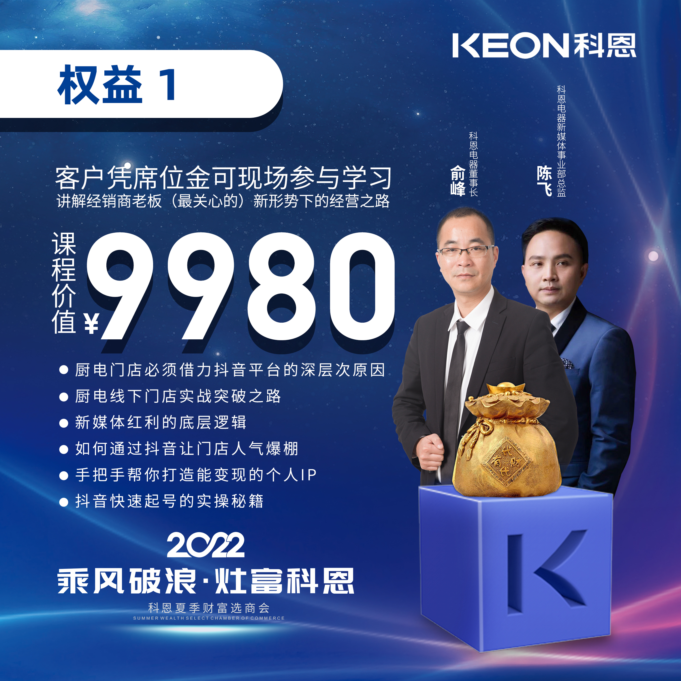 權(quán)益一、客戶憑席位金可現(xiàn)場參與學習時下經(jīng)銷商老板最為關心的新形勢下的經(jīng)營之路,科恩電器董事長攜新媒體事業(yè)中心團隊親身入局,創(chuàng)新立意開辟抖音引流變現(xiàn)的新賽道新玩法,手把手幫你打造能變現(xiàn)的個人IP,助力經(jīng)銷商在新零售市場前景下,輕松實現(xiàn)彎道超車。