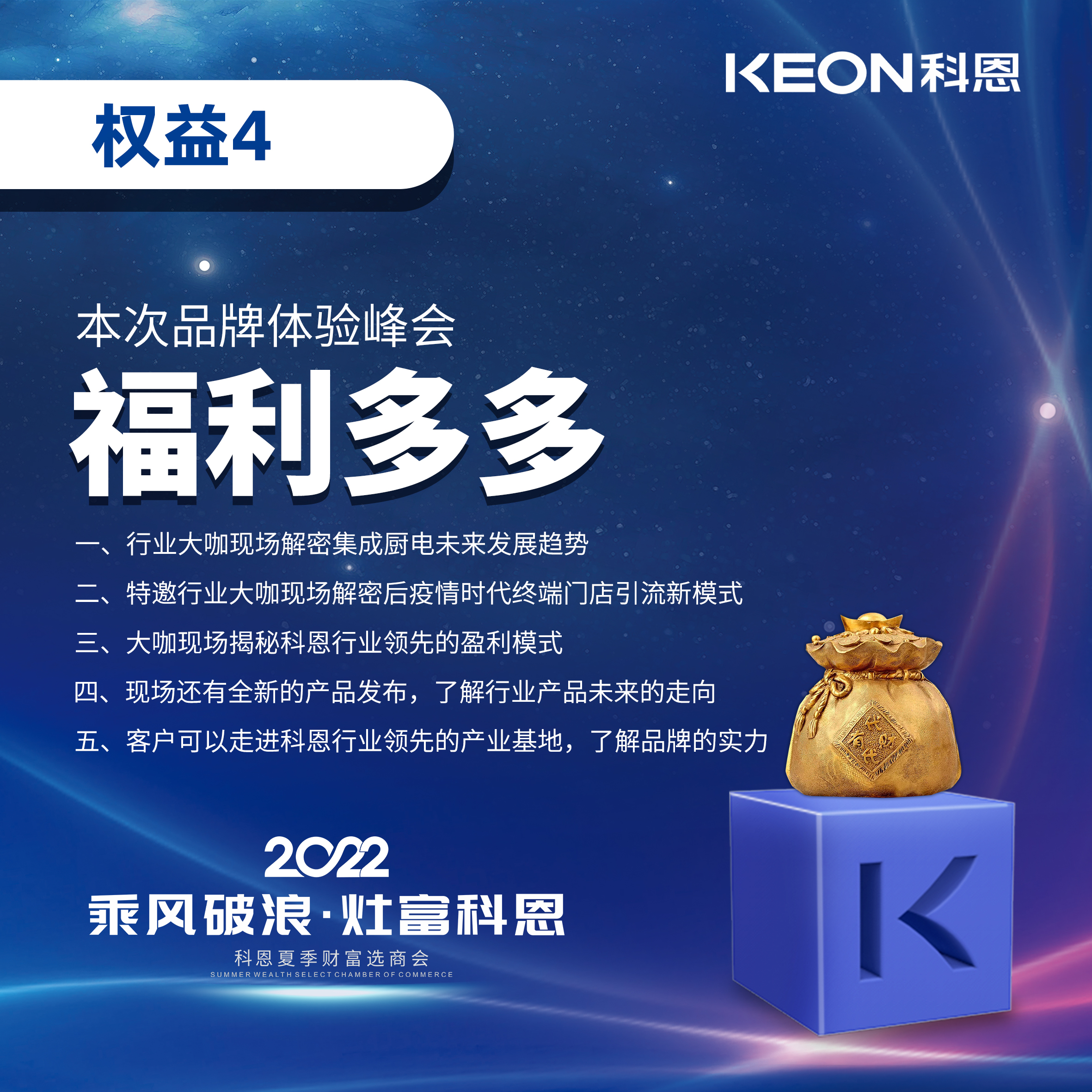 【乘風破浪·灶富科恩】——2022科恩夏季財富選商會將于7月27日在廚具之都嵊州隆重開啟,屆時將廣邀廚電行業(yè)資深大咖、業(yè)界菁英齊聚一堂,共同探討廚電行業(yè)發(fā)展之路的機遇和挑戰(zhàn),開創(chuàng)行業(yè)新賽道,更有專屬六大特權(quán),把握機會,緊握財富之手,六大權(quán)益,共享巨擘商機,趁現(xiàn)在,贏未來!