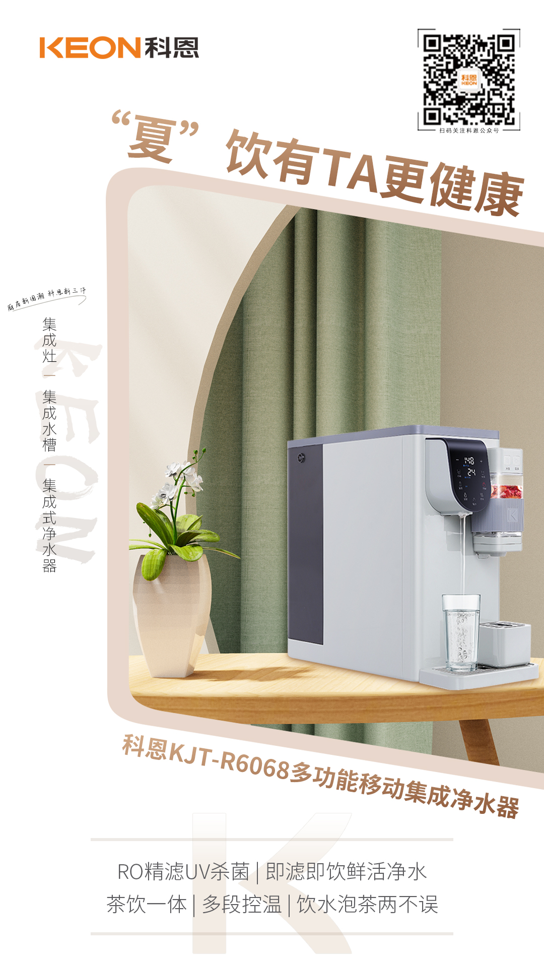 下廚、飯后喝一口冷飲冰涼解暑,無限續杯的快樂簡直不要太幸福,但也容易傷胃傷身,不如用科恩多功能移動集成凈水器帶給你一夏天的健康快樂吧!多種模式精準控溫,定量自動取水,不溢杯不浪費,茶飲一體,喝水泡茶兩不誤,寶寶的45℃泡奶首選,日常55℃溫熱養胃,男士們80℃品茗優選,長輩的85-100℃養生特選,一鍵盡在掌握之中。濾芯采用RO四膜七級精濾技術,搭載UV抑菌功能,即濾即飲鮮活凈水,夏飲有TA更健康!