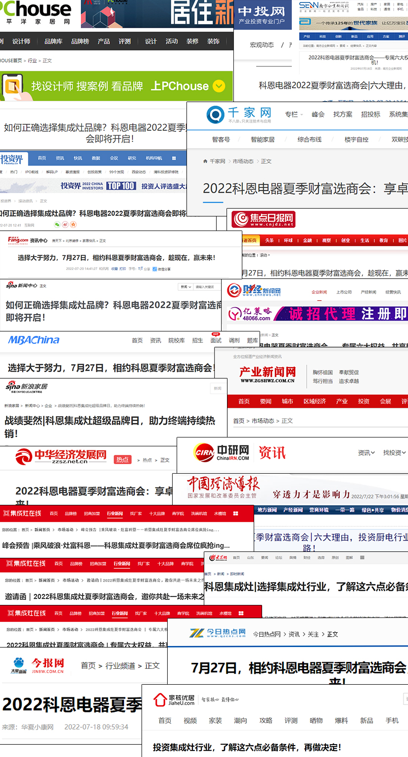 新浪家居、網易家居、太平洋家居網、環球家電網、廚電行業資訊、集成灶在線、大眾網、中華網、今報網、財經新聞網、中國貿易新聞、經濟發展網、家電消費網、新浪財經頭條、中投網、千家網等幾十家重量級媒體爭相報道,2022科恩夏季財富選商會內容躋身熱門話題,引發全網轟動熱潮,相信本月27日的科恩夏季選商會必將引爆全網,熱力滿滿!