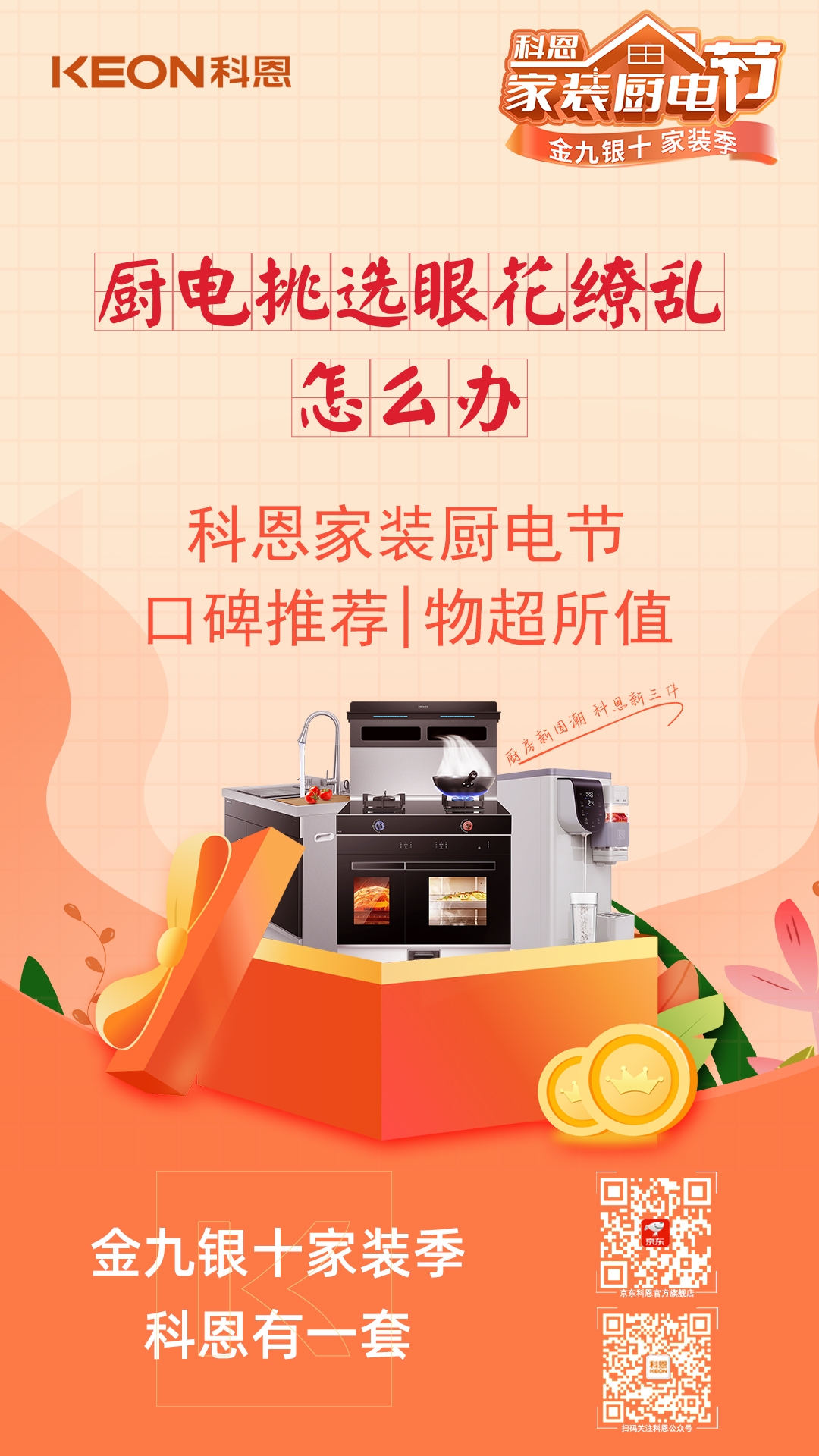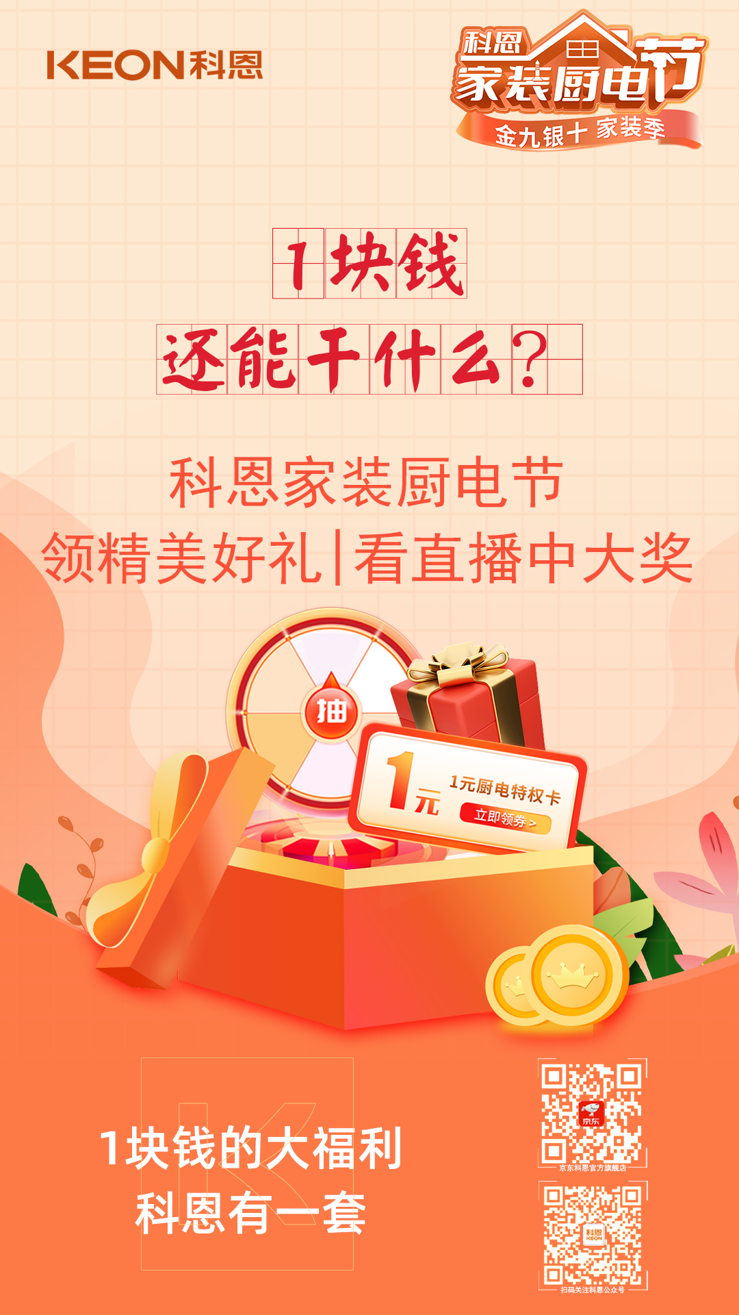 金九銀十家裝季,科恩家裝廚電節,1元特權卡,樂享六喜禮,福利連連,驚喜不斷,趁此機會,用更優惠的價格購得稱心如意的廚電好物,年前入住美滋滋!