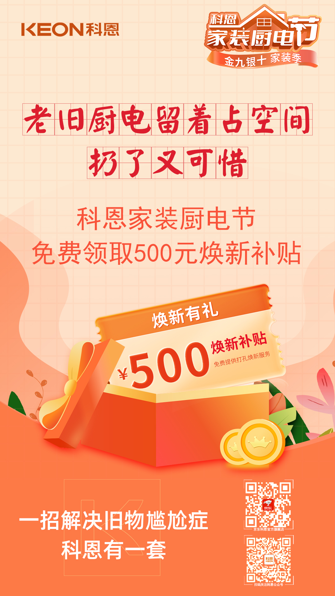 用了好多年的老舊廚電,不僅耗能大,放在家里更顯臟亂差,爸媽不舍得換,留著占空間,扔了又可惜,就這樣將就湊合過了一年又一年,恰逢其時,參與科恩家裝廚電節,免費領取領取超值煥新煥新補貼,告別老舊廚電,開啟美好生活,一招解決舊物尷尬癥,科恩有一套!