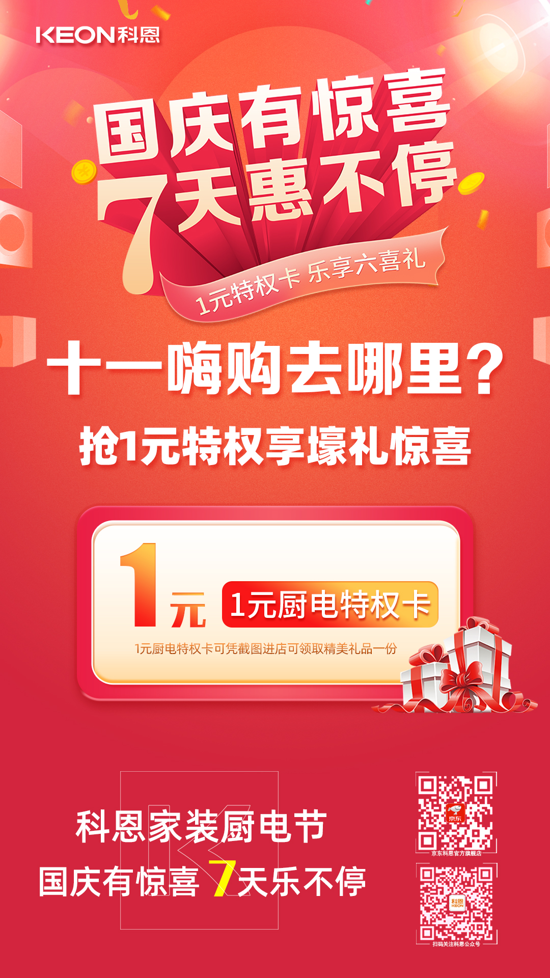 國慶價·提前享,科恩家裝廚電節之國慶專輯——國慶有驚喜,7天惠不停,科恩集成灶帶你嗨購黃金周!
