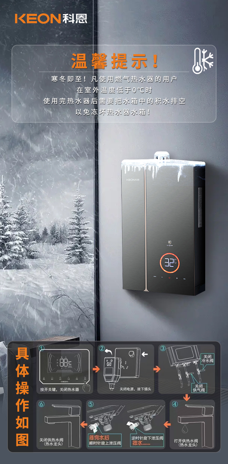 寒冬將至!當室外溫度低于0℃時,使用完熱水器后,若不及時將熱水器里的水排干凈,冷空氣變會倒灌進熱水器內部,水結冰后體積膨脹,容易凍壞熱水器水箱,造成不必要的麻煩和損失!因此,做好熱水器的防凍措施非常有必要!