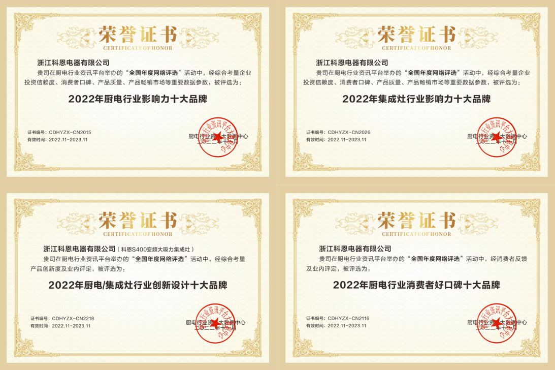 中國廚電行業年度重量級獎項“ 十大品牌 ”評選入榜名單正式揭曉,熱烈祝賀浙江科恩電器有限公司實力榮獲2022年度
