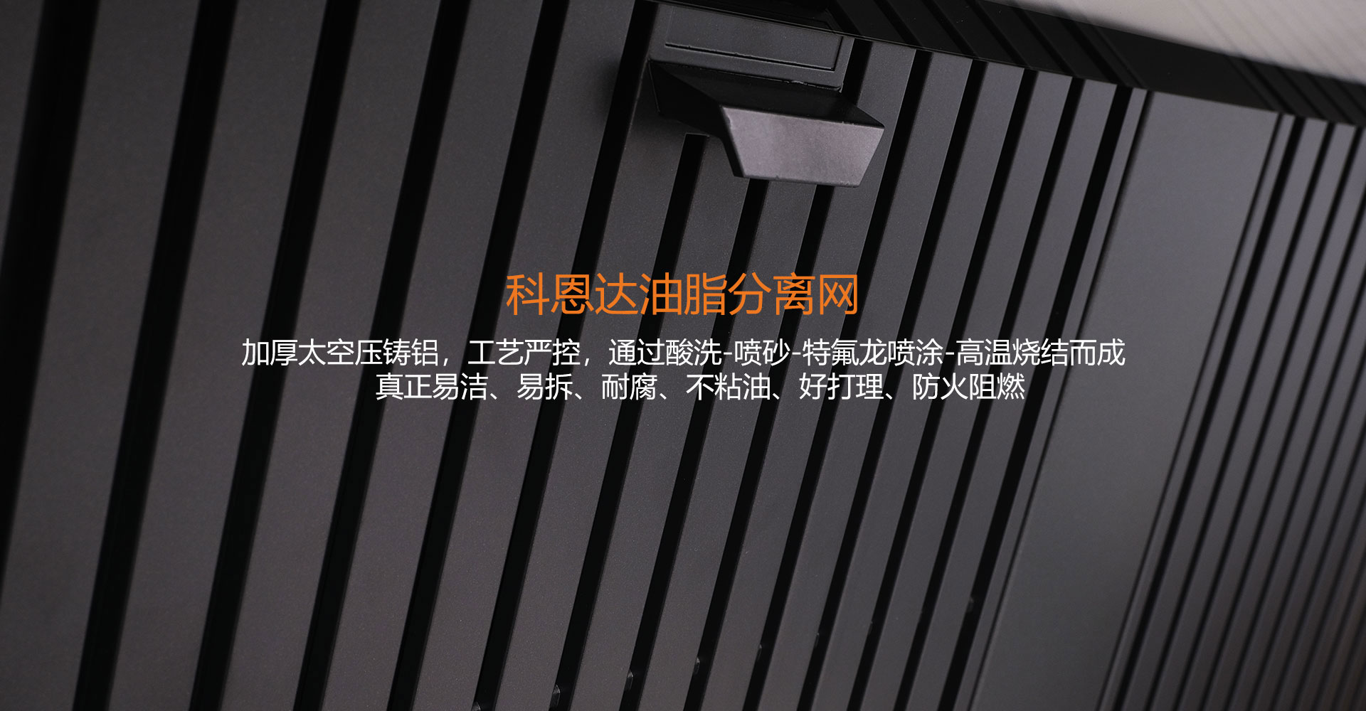 科恩達三層油脂分離網(wǎng),加厚太空壓鑄鋁,工藝嚴(yán)控,通過酸洗-噴砂-特氟龍噴涂-高溫?zé)Y(jié)而成真正易潔、易拆、耐腐、不粘油、好打理防火阻燃。