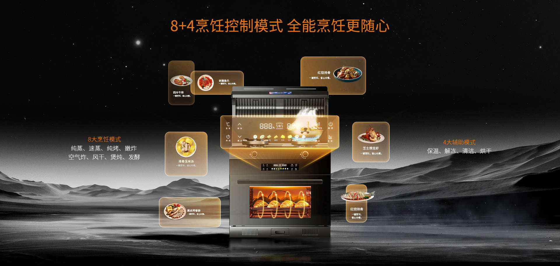 科恩G600防爆免清洗集成灶一鍵開啟全新烹飪模式蒸烤獨立設置,30L烤箱+50L蒸箱,可一次滿足,兩種需求G600可實現蒸烤炸燉,多種烹飪方式。