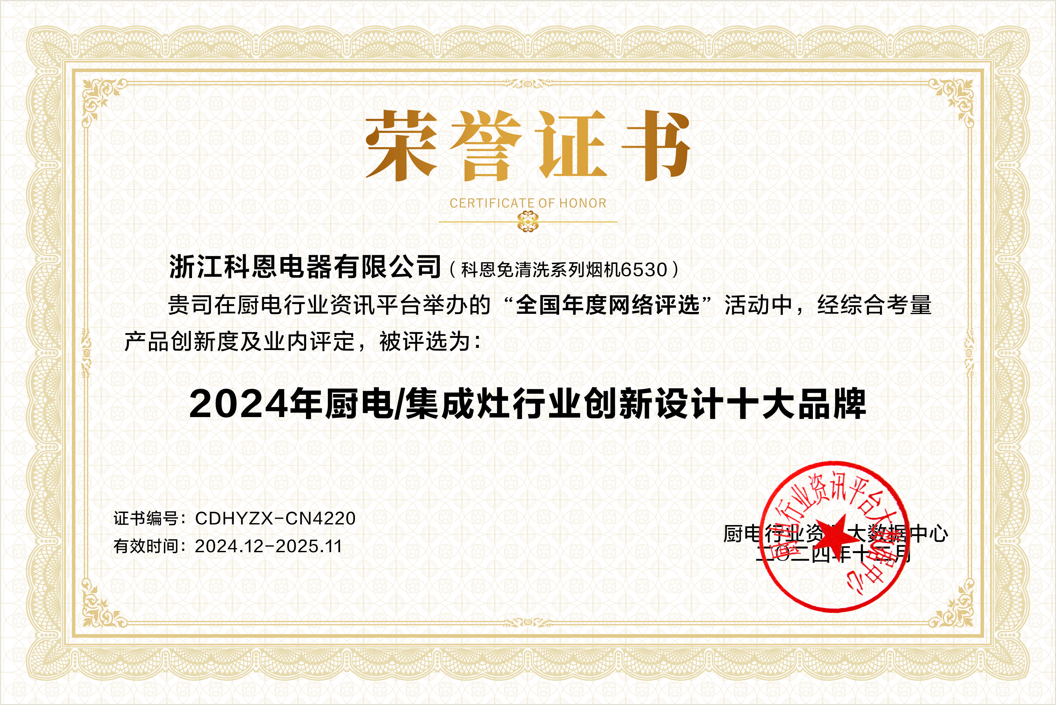 在眾多創(chuàng)新產(chǎn)品中,科恩6530免清洗煙機尤為引人注目。這款煙機憑借獨特的免清洗特質(zhì),有效解決了傳統(tǒng)煙機清洗困難的痛點,為消費者帶來了極大的便利。其創(chuàng)新性的設(shè)計不僅提升了產(chǎn)品的實用性,還在美學(xué)與功能的融合上達(dá)到了新的高度,榮獲“2024年廚電/集成灶創(chuàng)新設(shè)計十大品牌”獎實至名歸。這一獎項的獲得,也充分彰顯了科恩電器在產(chǎn)品設(shè)計創(chuàng)新方面的領(lǐng)先地位。