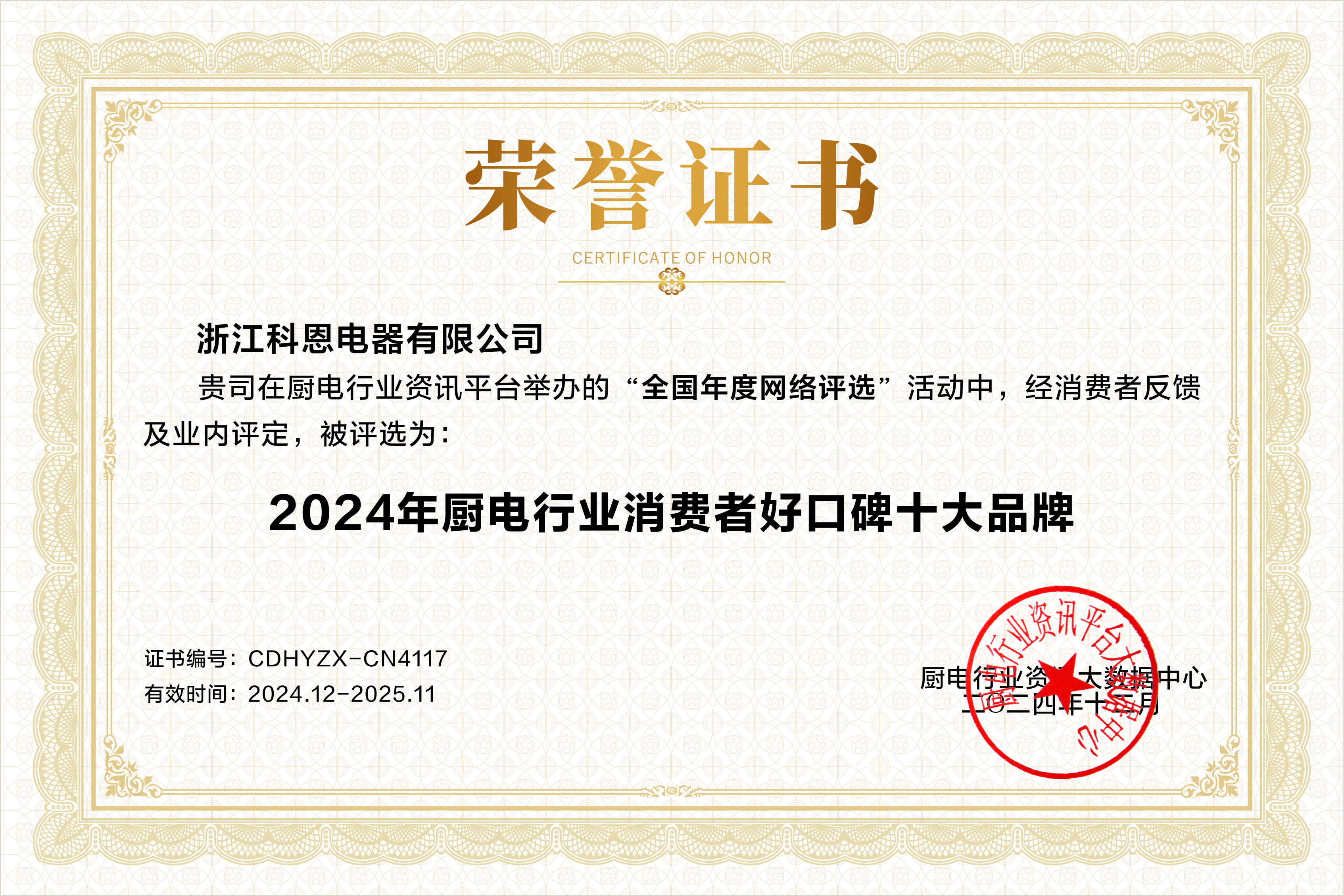 浙江科恩電器有限公司憑借其卓越的綜合實力,在眾多品牌中脫穎而出,一舉斬獲多項殊榮,包括2024年廚電行業(yè)影響力十大品牌、2024年廚電行業(yè)消費者好口碑十大品牌以及2024年廚電/集成灶創(chuàng)新設(shè)計十大品牌,再度成為行業(yè)矚目的焦點。