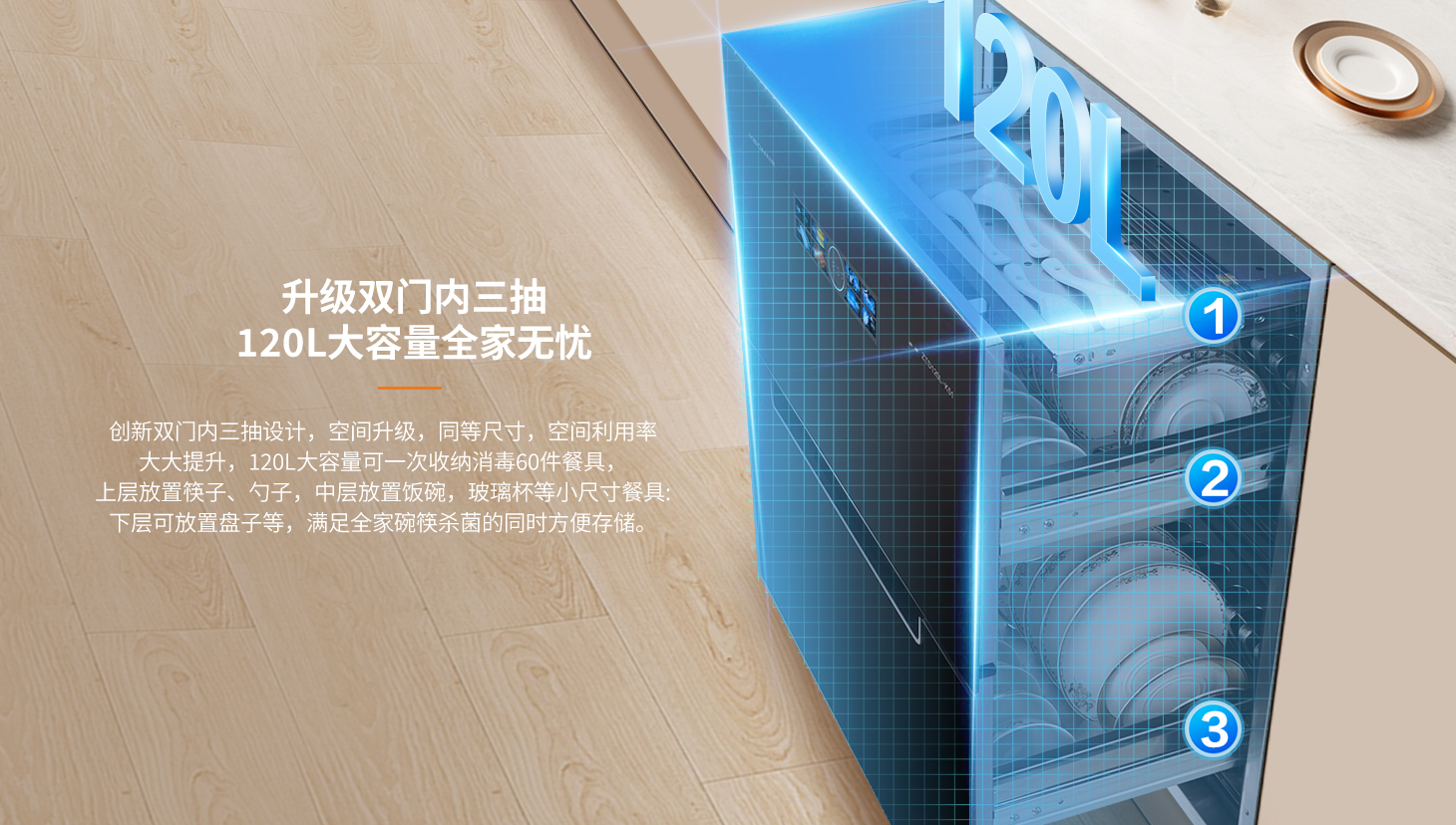 搭配炫彩觸控屏,提升使用便捷性,紫外線+臭氧+高溫三重消殺技術(shù),覆蓋奶瓶、兒童碗勺等敏感物品。升級(jí)雙門內(nèi)三抽配備抑菌隔層,120L大容量全家無憂,筷子抽屜獨(dú)立設(shè)計(jì),避免交叉污染。專為母嬰家庭設(shè)計(jì),保障用品長效潔凈。