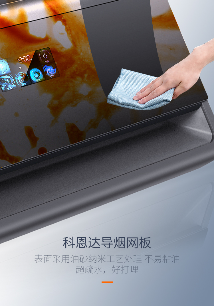 7270整機(jī)采用特氟龍工藝,一體拉伸沖壓成型,美觀大氣,一擦即凈。磁吸式科恩達(dá)網(wǎng)板,一拉一提,拆卸清洗簡(jiǎn)單方便,科恩達(dá)網(wǎng)板表面采用油砂納米科學(xué)工藝,讓油污難以附著,超疏水自清潔。電加熱清洗功能,自動(dòng)甩掉油污。保持煙機(jī)強(qiáng)勁吸力,清潔不再是難題。