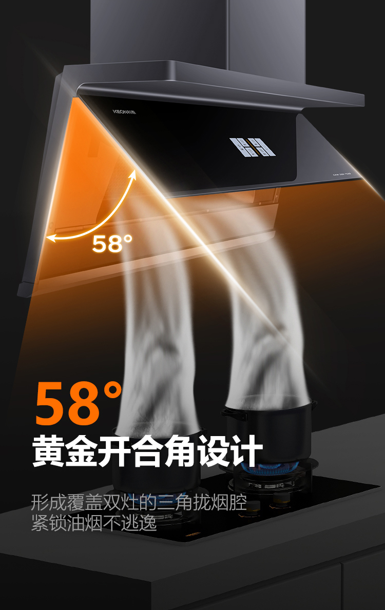28m³/min 颶風吸力,爆炒油煙瞬凈。1060Pa 強風壓,無懼公共煙道阻力。讓廚房空氣時刻清新。900mm 開合攏煙屏+58°黃金開合角,形成覆蓋雙灶的三角攏煙腔,緊鎖油煙不逃逸,低空近吸讓油煙未升騰即被鎖定,從此告別油煙撲臉的尷尬。