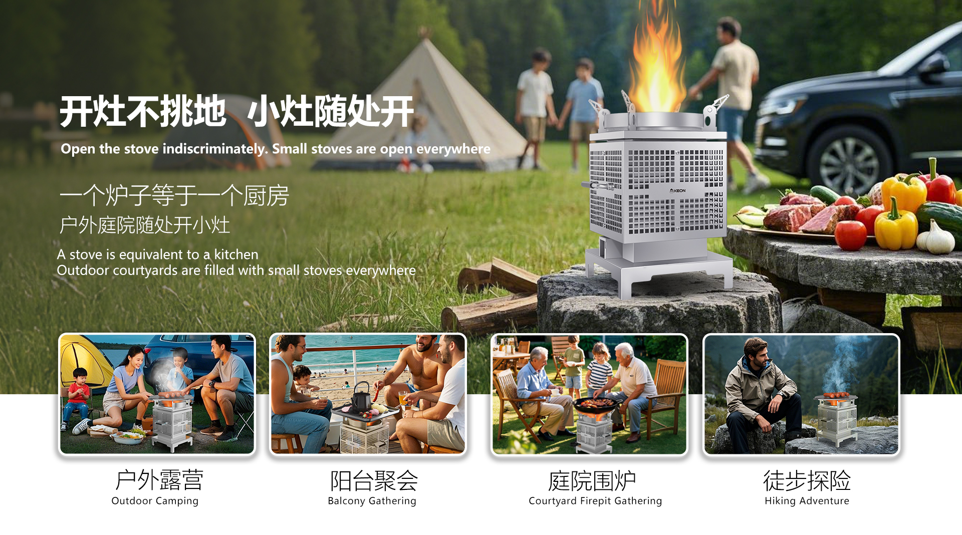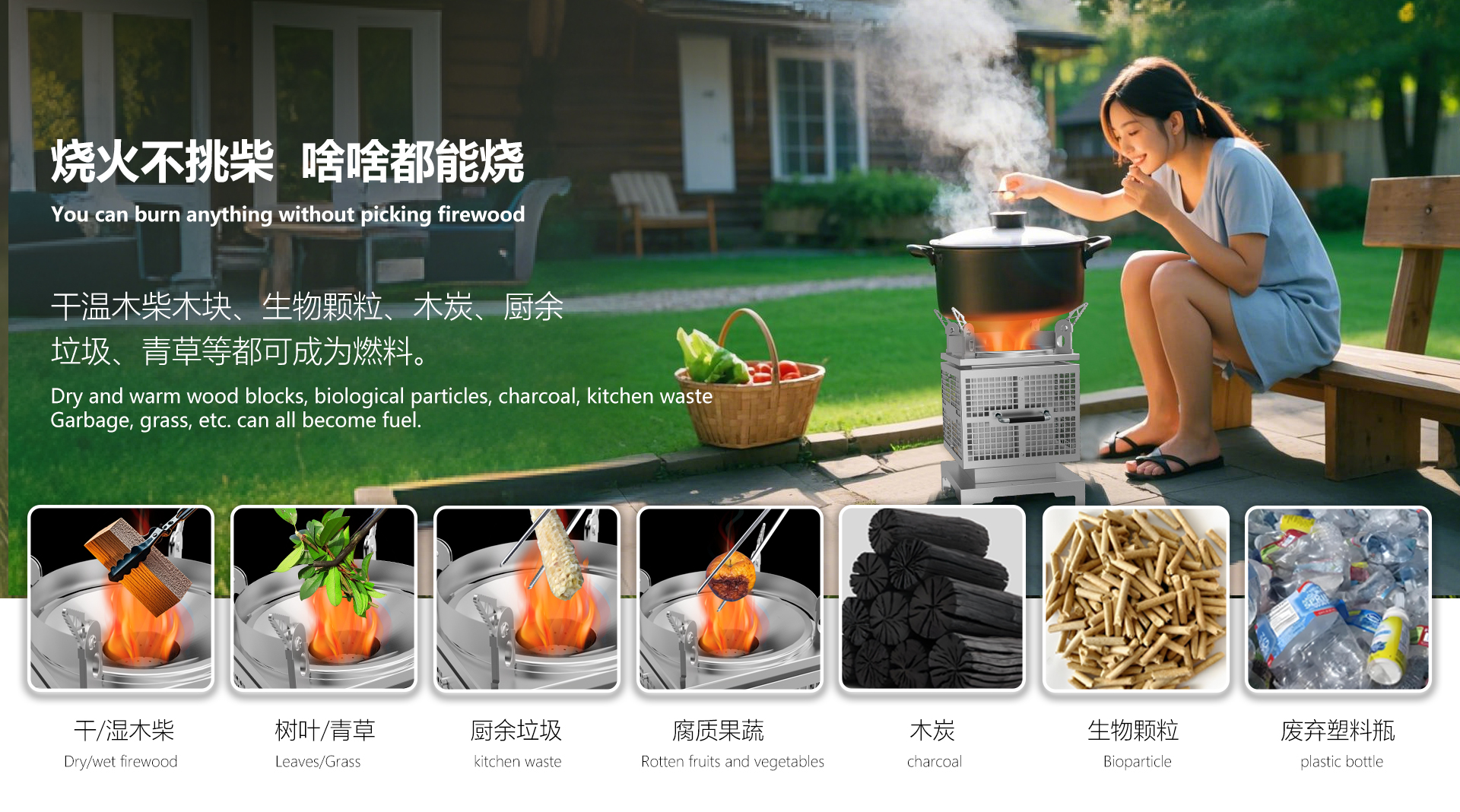 萬物皆燃,不挑燃料。干濕木塊,枯枝敗葉,煤炭青草,隨手可得的可燃物,都是能量源泉無需特意采購,現撿樹枝即能用。告別燃料焦慮,戶外烹飪更隨心,節能省柴,環保出行無負擔。點火速燃,猛火無煙。紙巾細枝,輕松引燃不費力,風機助力,生火速度超預期,3D繞流爐膛,科學供氧促燃燒,初次燃燒到高效燃燒真正無煙塵,爆炒不嗆鼻,圍爐無煙擾。