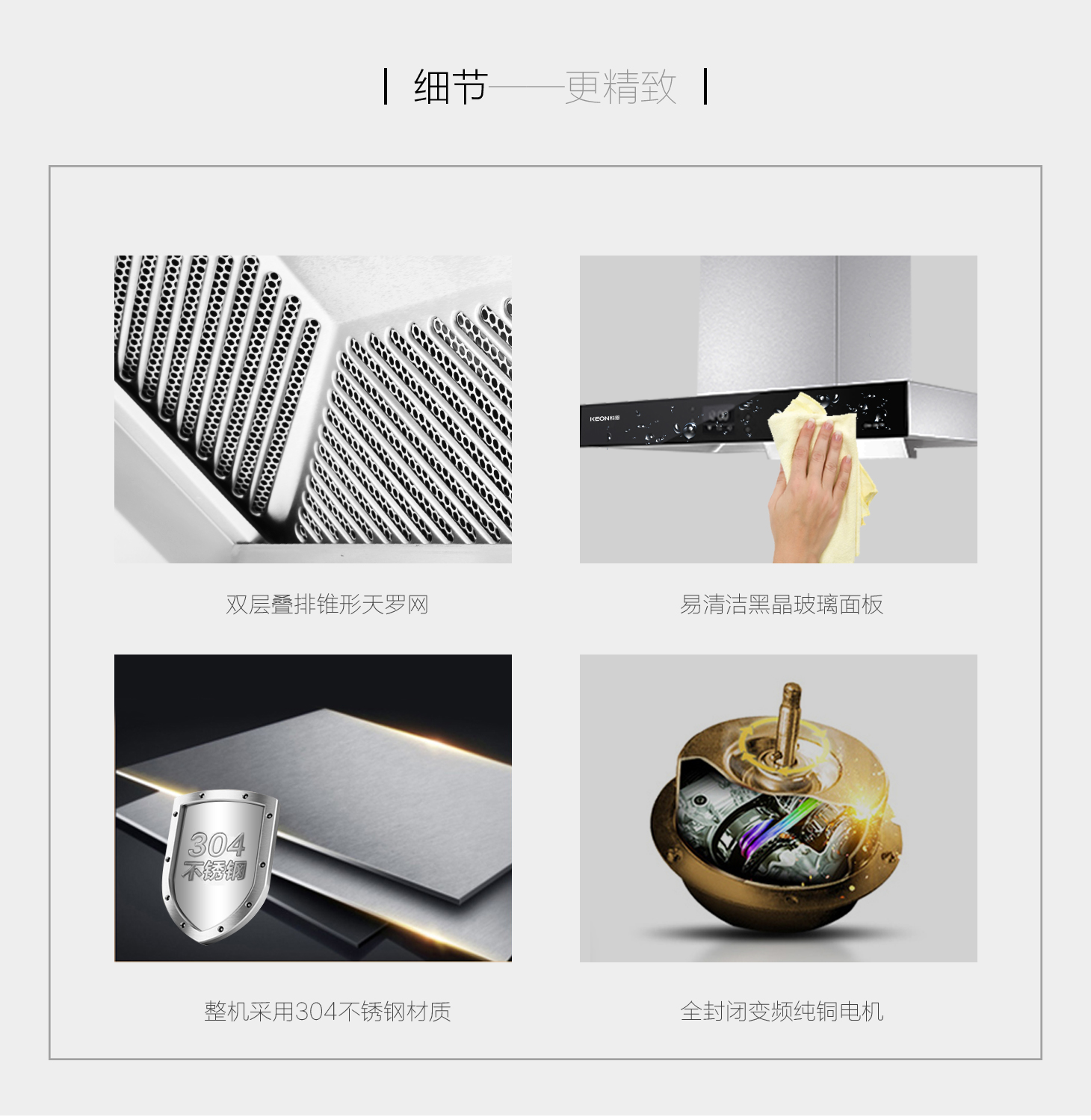 雙層疊排錐形凈濾網,導油分離油煙更徹底。