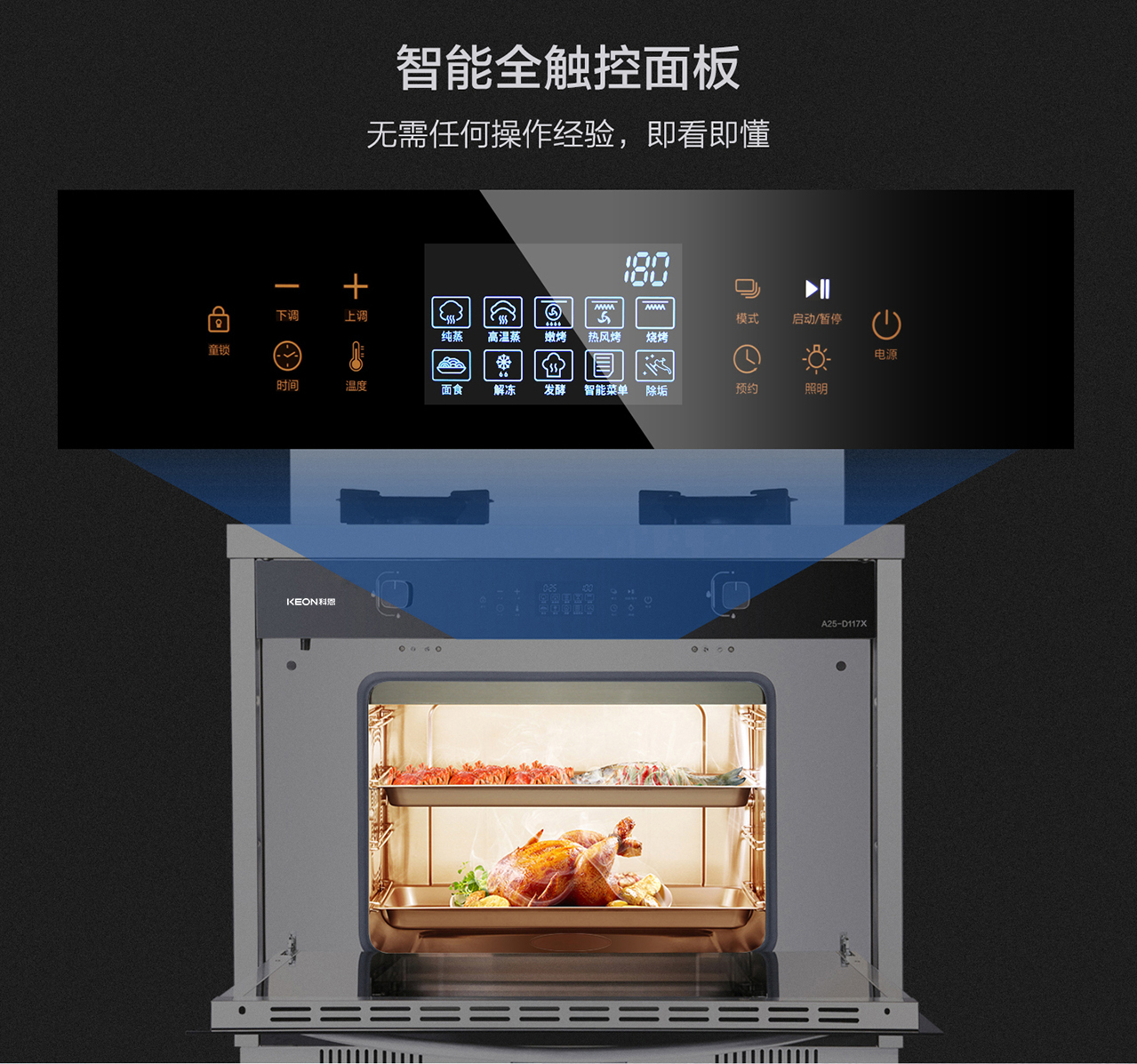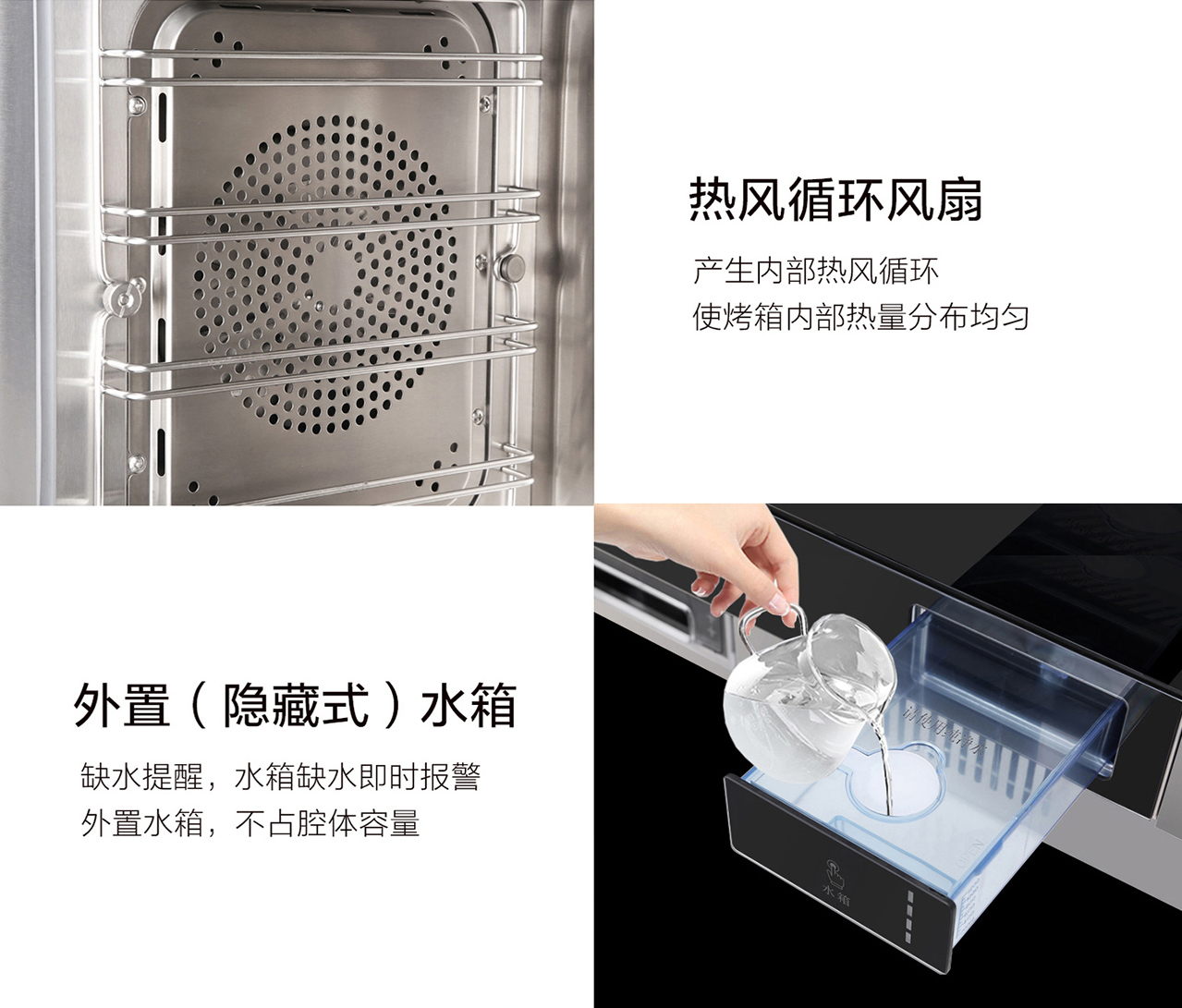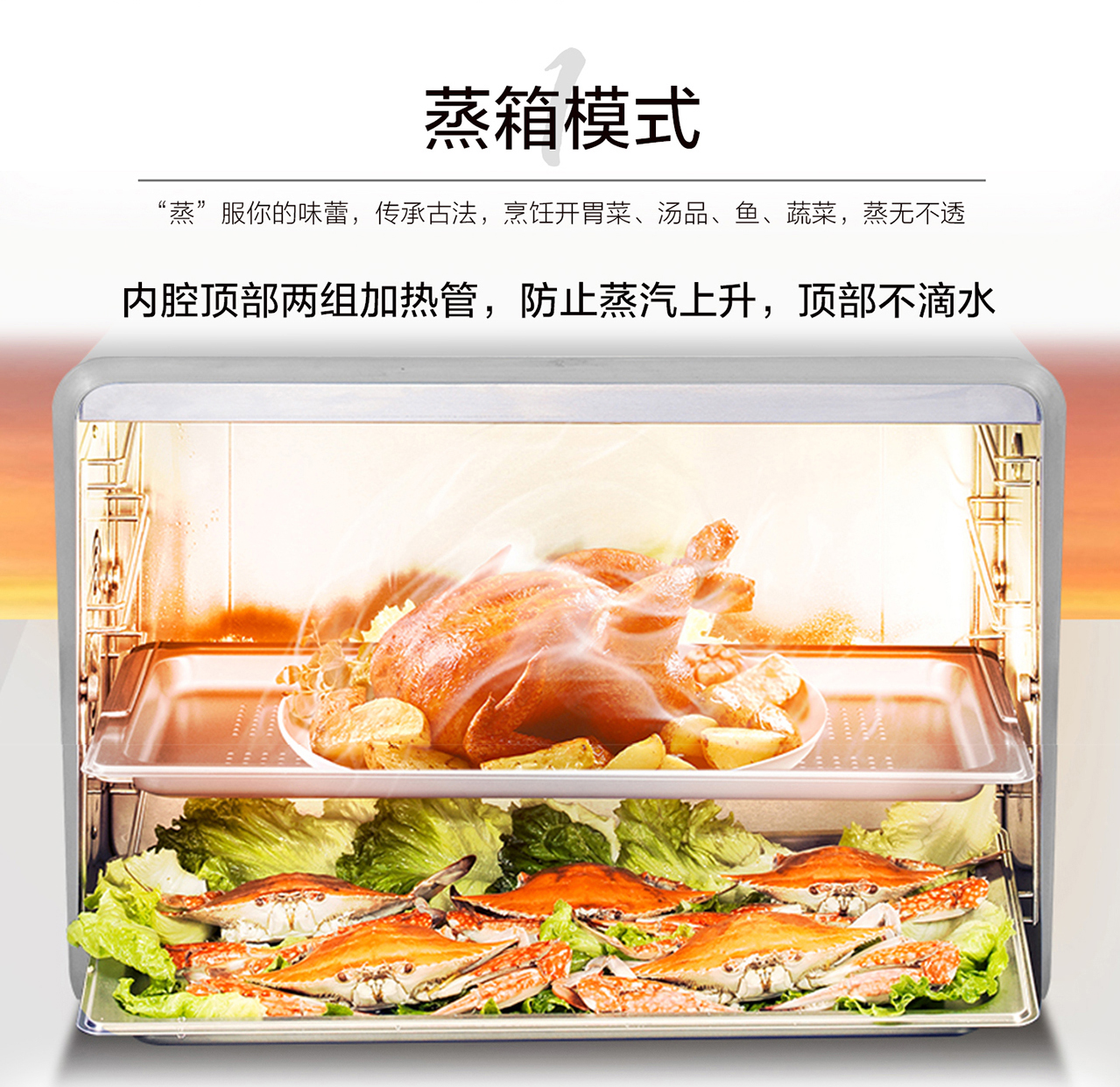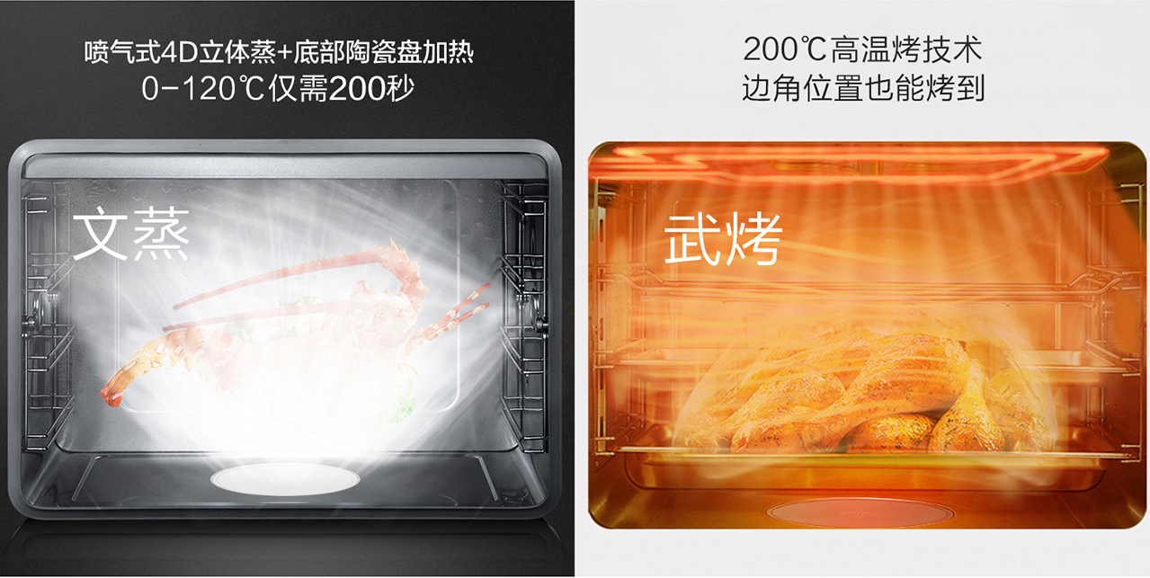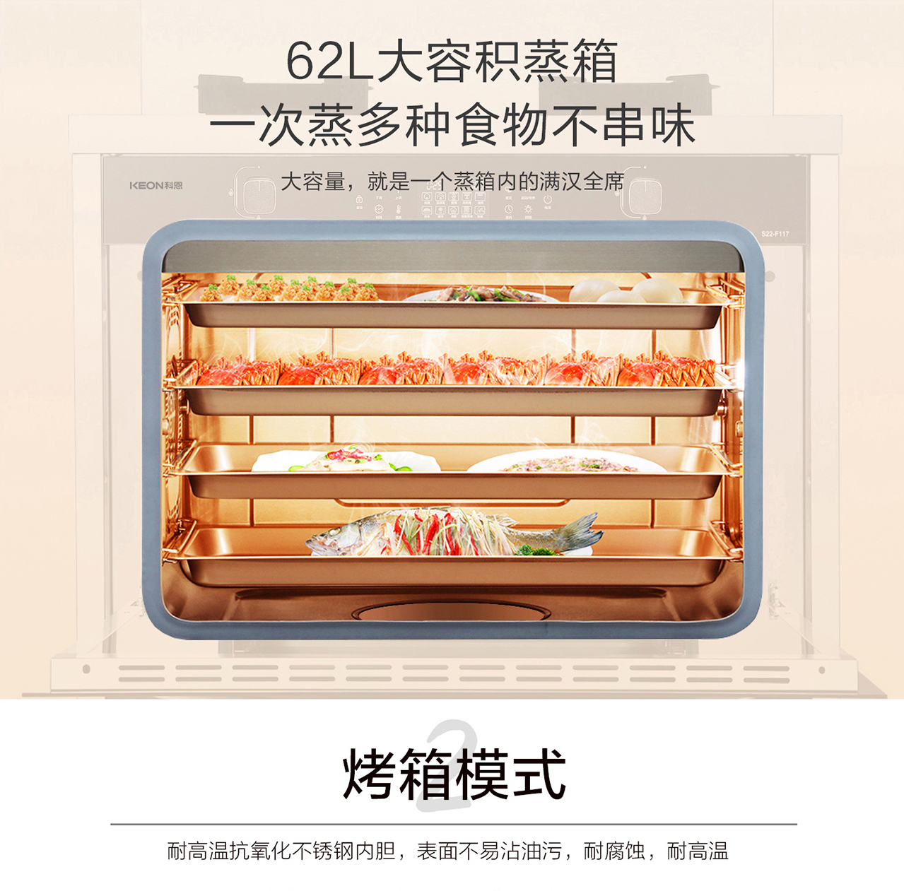 62L大容量食品級304不銹鋼內膽,上下4層設計,9種蒸烤模式。