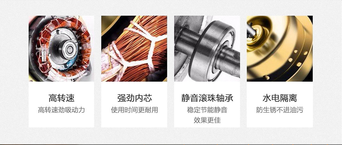 全封閉雙滾珠靜音電機,高速運轉不顛簸,高效耐用,防銹耐污。