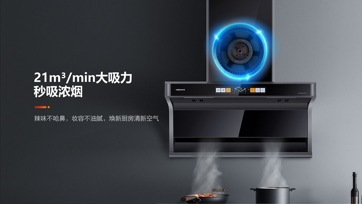 21m3/min颶風(fēng)吸力,瞬吸濃煙,辣味不嗆鼻,煥新廚房清新空氣