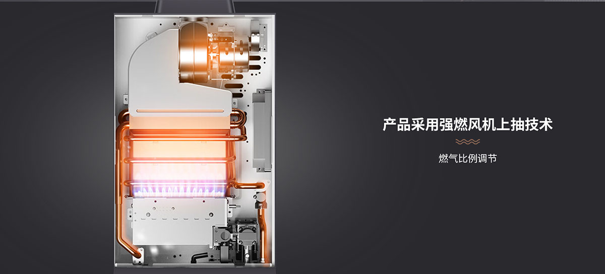 產品采⽤強燃⻛機上抽技術,燃⽓⽐例調節