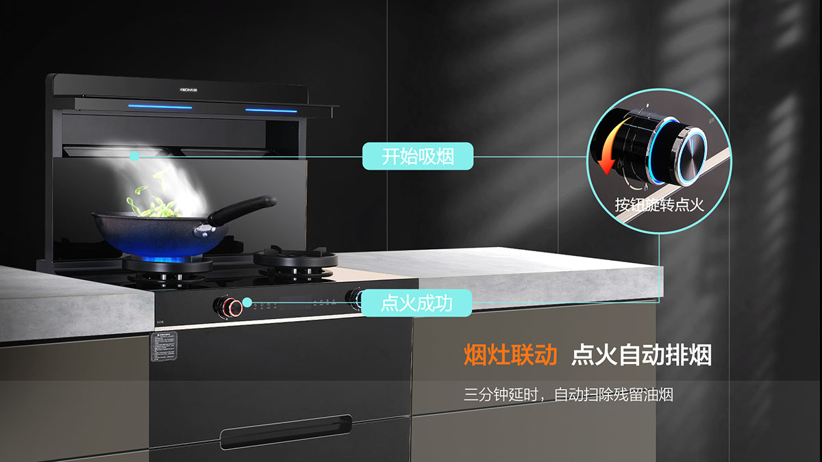 煙灶聯(lián)動,點火自動排煙,三分鐘延時,自動掃除殘留油煙